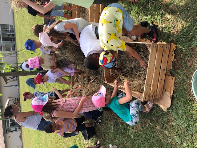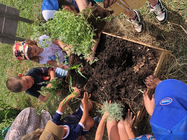 - Plantations (lavande, thym, origan, verveine, rhubarbe, mélisse, tournesol, épinard en arbre, courges) et découverte sensorielle